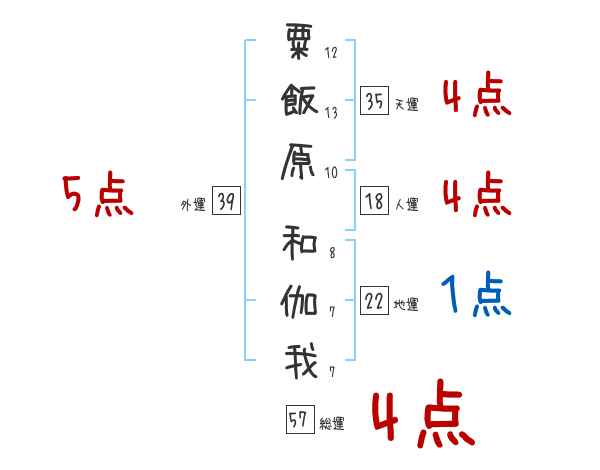 外運![]() | 粟飯原和伽我さんの外運は39画の5つ星!社交性に優れ人望が厚い。人の上に立ち成功する。 生活面を象徴する運勢です。外部から受ける影響力を表し、結婚運、家庭運や職場、環境への順応性を表します。 |