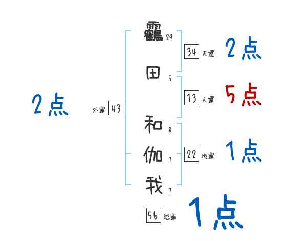 天運![]() | 靏田和伽我さんの天運は34画の2つ星!独創性に優れるが、自尊心が強く災難に注意しましょう。 家系が持つ宿命的な運勢を表します。祖先から受け継いだ苗字ですので自分の力が及びません。家柄を象徴します。 |