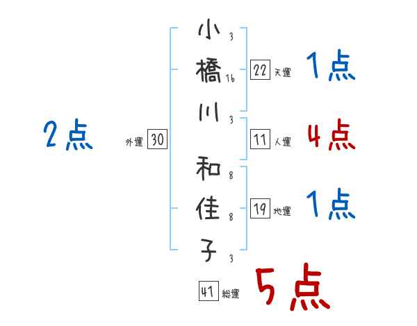天運![]() | 小橋川和佳子さんの天運は22画の1つ星!努力することが苦手ないっぽう手先が器用。芸術性にも優れる。 家系が持つ宿命的な運勢を表します。祖先から受け継いだ苗字ですので自分の力が及びません。家柄を象徴します。 |