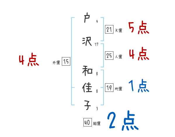外運![]() | 戸沢和佳子さんの外運は15画の4つ星!人徳があり出世する。順調に物事を進め円満な人生。 生活面を象徴する運勢です。外部から受ける影響力を表し、結婚運、家庭運や職場、環境への順応性を表します。 |
