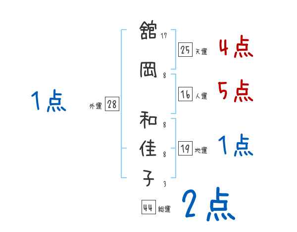 総運![]() | 舘岡和佳子さんの総運は44画の2つ星!誠実で慎重な性格。物事を考えすぎないように注意しましょう。 あなたの人生を表す1番重要な運勢です。生涯を通じて影響する総合運となり、主に50歳以降の晩年期に影響を及ぼします。 |