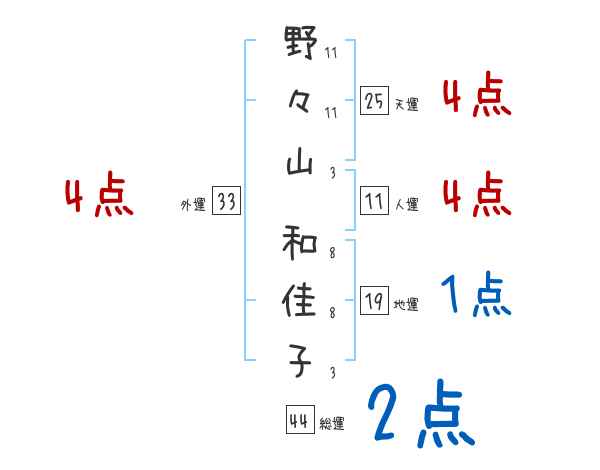 総運![]() | 野々山和佳子さんの総運は44画の2つ星!誠実で慎重な性格。物事を考えすぎないように注意しましょう。 あなたの人生を表す1番重要な運勢です。生涯を通じて影響する総合運となり、主に50歳以降の晩年期に影響を及ぼします。 |