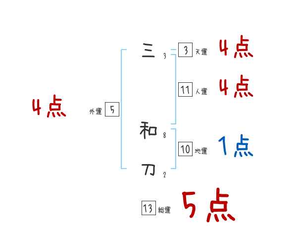天運![]() | 三和刀さんの天運は3画の4つ星!活動的で才能に恵まれ、多くの信頼を得る。希望に満ち成長する。 家系が持つ宿命的な運勢を表します。祖先から受け継いだ苗字ですので自分の力が及びません。家柄を象徴します。 |