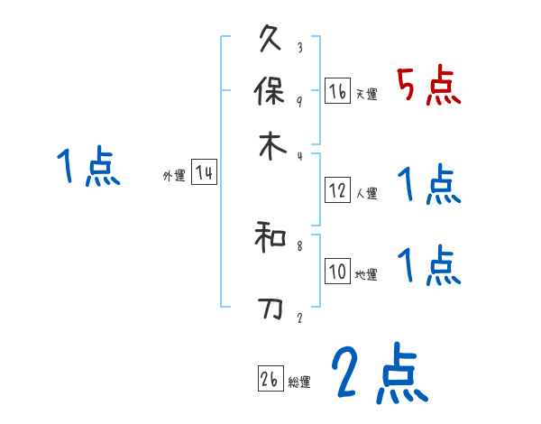 外運![]() | 久保木和刀さんの外運は14画の1つ星!人に対して優しいがストレスを溜め込みがち。人間関係のトラブルを避けるよう気をつけましょう。 生活面を象徴する運勢です。外部から受ける影響力を表し、結婚運、家庭運や職場、環境への順応性を表します。 |