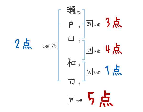 天運![]() | 瀬戸口和刀さんの天運は27画の3つ星!頭脳明晰だが強情で摩擦が多い傾向。孤立に注意。 家系が持つ宿命的な運勢を表します。祖先から受け継いだ苗字ですので自分の力が及びません。家柄を象徴します。 |