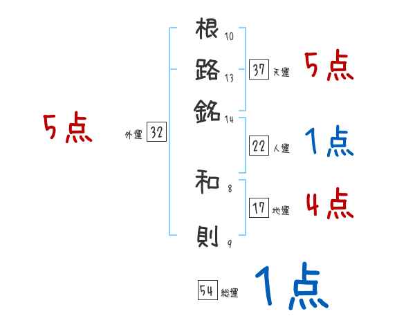 外運![]() | 根路銘和則さんの外運は32画の5つ星!柔軟性があり成功する。チャンスが多く金運が良い。 生活面を象徴する運勢です。外部から受ける影響力を表し、結婚運、家庭運や職場、環境への順応性を表します。 |