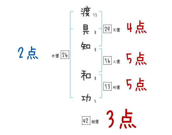人運![]() | 渡具知和功さんの人運は16画の5つ星!人望が厚く大きく発展する。逆転成功が見える。 性格や才能などを表す2番目に重要な運勢です。人間関係や協調性、社会的な成功に影響します。主に20歳から50歳ぐらいまでの中年期の運勢を表します。 |