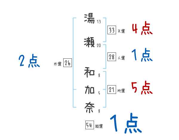 外運![]() | 湯瀬和加奈さんの外運は26画の2つ星!波瀾万丈かも。信頼できる人を大事にしましょう。 生活面を象徴する運勢です。外部から受ける影響力を表し、結婚運、家庭運や職場、環境への順応性を表します。 |