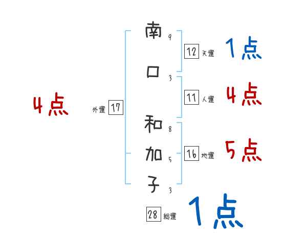 天運![]() | 南口和加子さんの天運は12画の1つ星!簡単な失敗で諦めてしまいやすいかも。着実に行動すると良いでしょう。 家系が持つ宿命的な運勢を表します。祖先から受け継いだ苗字ですので自分の力が及びません。家柄を象徴します。 |