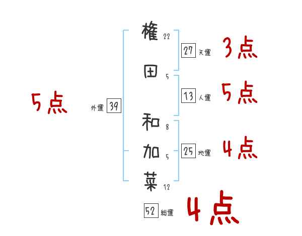 外運![]() | 権田和加菜さんの外運は39画の5つ星!社交性に優れ人望が厚い。人の上に立ち成功する。 生活面を象徴する運勢です。外部から受ける影響力を表し、結婚運、家庭運や職場、環境への順応性を表します。 |