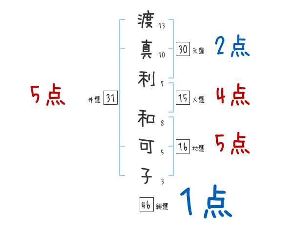 外運![]() | 渡真利和可子さんの外運は31画の5つ星!社交性があり判断力に優れる。順風満帆な人生で円満な生活。 生活面を象徴する運勢です。外部から受ける影響力を表し、結婚運、家庭運や職場、環境への順応性を表します。 |