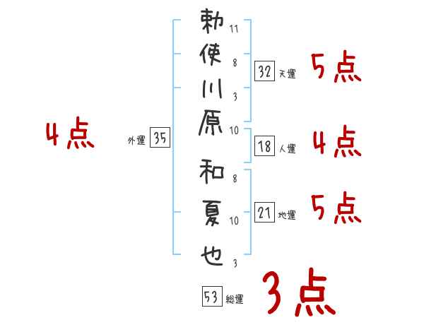 外運![]() | 勅使川原和夏也さんの外運は35画の4つ星!温厚な性格で感受性が高い。穏和な性格で人望が厚い。 生活面を象徴する運勢です。外部から受ける影響力を表し、結婚運、家庭運や職場、環境への順応性を表します。 |