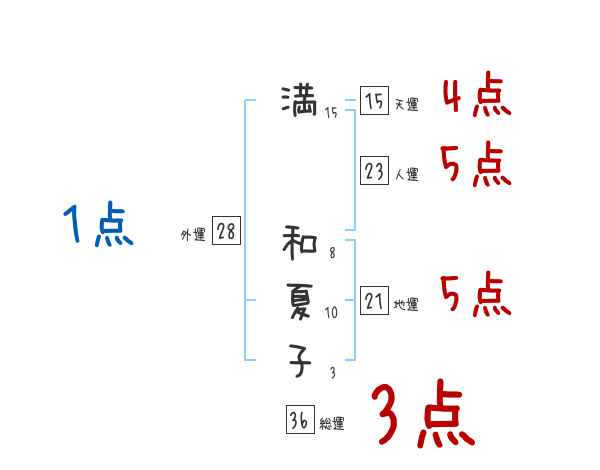 外運![]() | 満和夏子さんの外運は28画の1つ星!家庭環境に注意。スポーツで活躍できる能力があるかも。 生活面を象徴する運勢です。外部から受ける影響力を表し、結婚運、家庭運や職場、環境への順応性を表します。 |