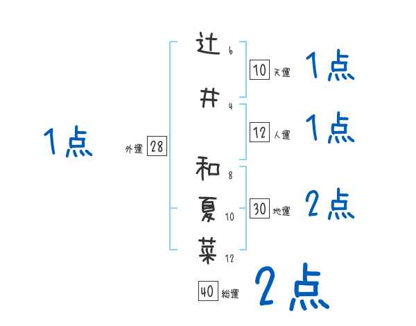 外運![]() | 辻井和夏菜さんの外運は28画の1つ星!家庭環境に注意。スポーツで活躍できる能力があるかも。 生活面を象徴する運勢です。外部から受ける影響力を表し、結婚運、家庭運や職場、環境への順応性を表します。 |