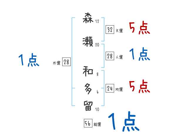 天運![]() | 森瀬和多留さんの天運は32画の5つ星!柔軟性があり成功する。チャンスが多く金運が良い。 家系が持つ宿命的な運勢を表します。祖先から受け継いだ苗字ですので自分の力が及びません。家柄を象徴します。 |