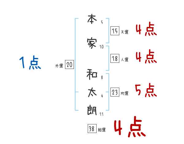 地運![]() | 本家和太朗さんの地運は23画の5つ星!想像力に優れ活力がある。一代で成功し名誉を手に入れる。 個性を表す基礎的な運勢です。性格形成や対人関係、行動力など家庭環境に影響されます。主に誕生してから20歳くらいまでの若年期の運勢を表します。 |
