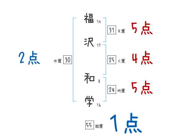 天運![]() | 福沢和学さんの天運は31画の5つ星!社交性があり判断力に優れる。順風満帆な人生で円満な生活。 家系が持つ宿命的な運勢を表します。祖先から受け継いだ苗字ですので自分の力が及びません。家柄を象徴します。 |