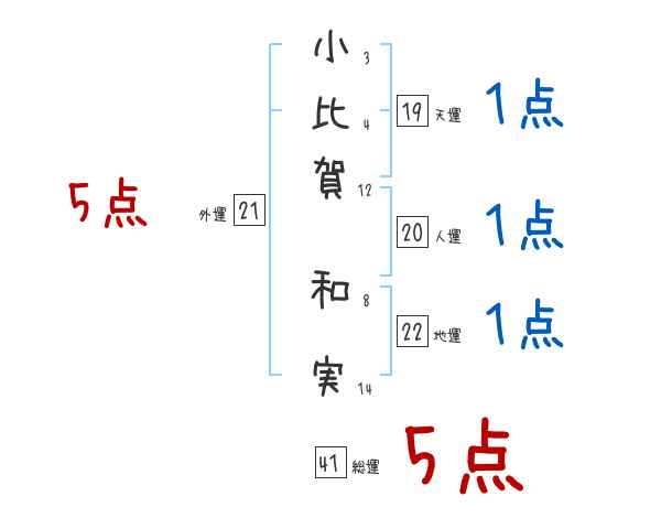 外運![]() | 小比賀和実さんの外運は21画の5つ星!統率力がある。独立し成功する。名誉を手に入れる。 生活面を象徴する運勢です。外部から受ける影響力を表し、結婚運、家庭運や職場、環境への順応性を表します。 |