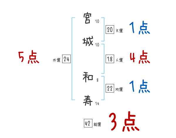外運![]() | 宮城和寿さんの外運は24画の5つ星!家庭運が良く順調な人生。金運にも恵まれる。 生活面を象徴する運勢です。外部から受ける影響力を表し、結婚運、家庭運や職場、環境への順応性を表します。 |