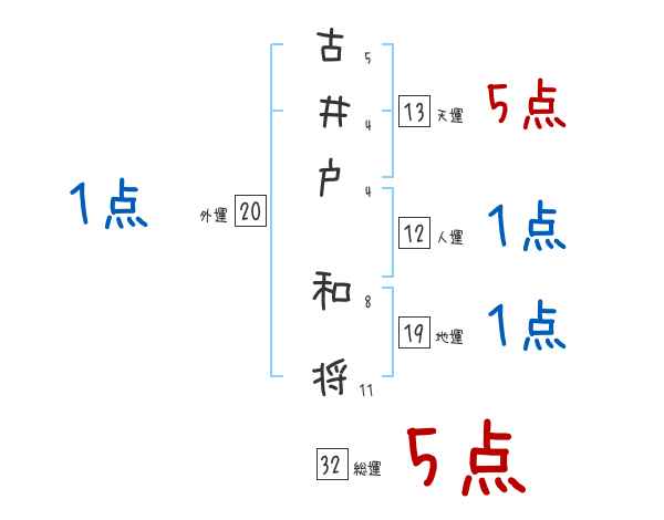 総運![]() | 古井戸和将さんの総運は32画の5つ星!柔軟性があり成功する。チャンスが多く金運が良い。 あなたの人生を表す1番重要な運勢です。生涯を通じて影響する総合運となり、主に50歳以降の晩年期に影響を及ぼします。 |
