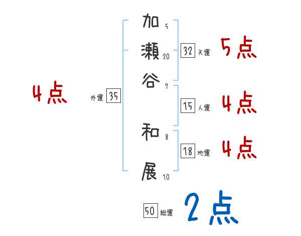 天運![]() | 加瀬谷和展さんの天運は32画の5つ星!柔軟性があり成功する。チャンスが多く金運が良い。 家系が持つ宿命的な運勢を表します。祖先から受け継いだ苗字ですので自分の力が及びません。家柄を象徴します。 |