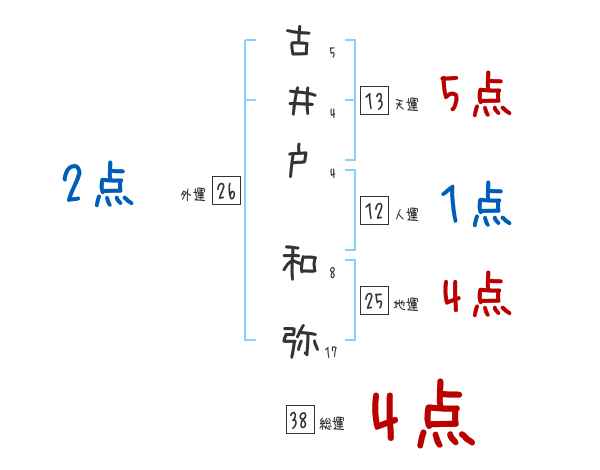 外運![]() | 古井戸和弥さんの外運は26画の2つ星!波瀾万丈かも。信頼できる人を大事にしましょう。 生活面を象徴する運勢です。外部から受ける影響力を表し、結婚運、家庭運や職場、環境への順応性を表します。 |