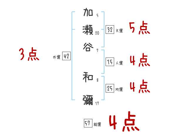 外運![]() | 加瀬谷和彌さんの外運は42画の3つ星!病気に注意。多芸であるが消極的でおとなしい。 生活面を象徴する運勢です。外部から受ける影響力を表し、結婚運、家庭運や職場、環境への順応性を表します。 |