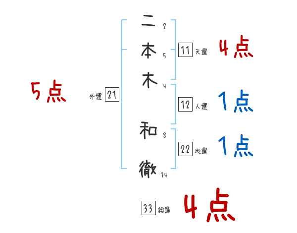 天運![]() | 二本木和徹さんの天運は11画の4つ星!着実に富や地位を得る幸運な人生。 家系が持つ宿命的な運勢を表します。祖先から受け継いだ苗字ですので自分の力が及びません。家柄を象徴します。 |