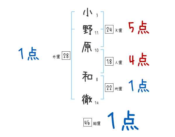外運![]() | 小野原和徹さんの外運は28画の1つ星!家庭環境に注意。スポーツで活躍できる能力があるかも。 生活面を象徴する運勢です。外部から受ける影響力を表し、結婚運、家庭運や職場、環境への順応性を表します。 |