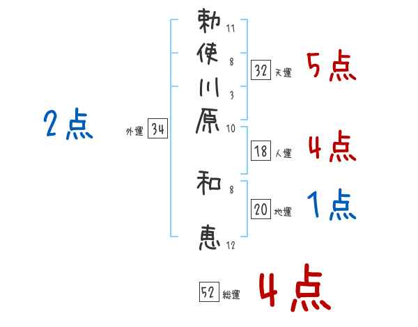 天運![]() | 勅使川原和恵さんの天運は32画の5つ星!柔軟性があり成功する。チャンスが多く金運が良い。 家系が持つ宿命的な運勢を表します。祖先から受け継いだ苗字ですので自分の力が及びません。家柄を象徴します。 |