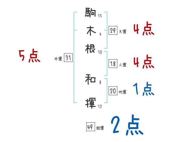 天運![]() | 駒木根和揮さんの天運は29画の4つ星!完全主義で才能がある。厳格な心の持ち主。 家系が持つ宿命的な運勢を表します。祖先から受け継いだ苗字ですので自分の力が及びません。家柄を象徴します。 |