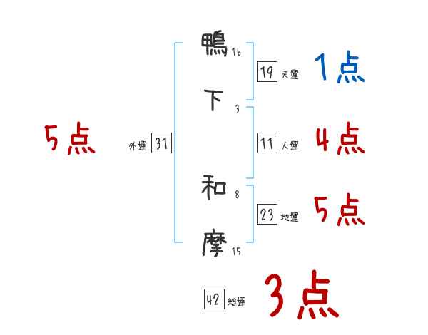 地運![]() | 鴨下和摩さんの地運は23画の5つ星!想像力に優れ活力がある。一代で成功し名誉を手に入れる。 個性を表す基礎的な運勢です。性格形成や対人関係、行動力など家庭環境に影響されます。主に誕生してから20歳くらいまでの若年期の運勢を表します。 |