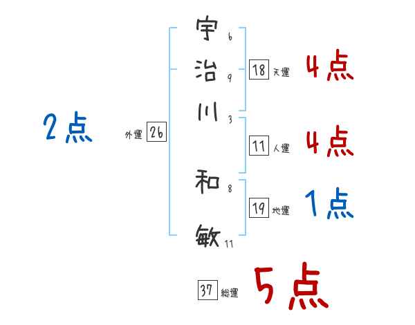天運![]() | 宇治川和敏さんの天運は18画の4つ星!情熱的で剛気。忍耐力があり信頼される。 家系が持つ宿命的な運勢を表します。祖先から受け継いだ苗字ですので自分の力が及びません。家柄を象徴します。 |