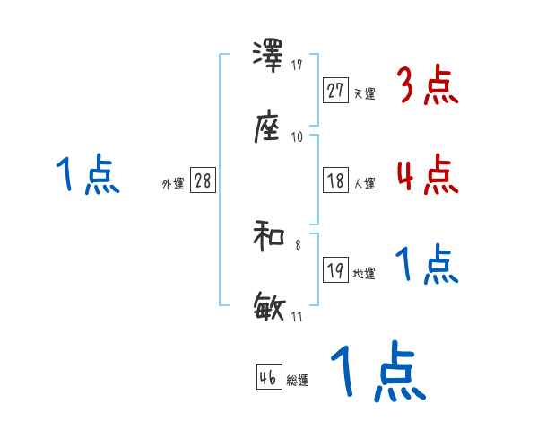 天運![]() | 澤座和敏さんの天運は27画の3つ星!頭脳明晰だが強情で摩擦が多い傾向。孤立に注意。 家系が持つ宿命的な運勢を表します。祖先から受け継いだ苗字ですので自分の力が及びません。家柄を象徴します。 |