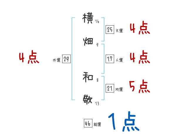 外運![]() | 横畑和敬さんの外運は29画の4つ星!完全主義で才能がある。厳格な心の持ち主。 生活面を象徴する運勢です。外部から受ける影響力を表し、結婚運、家庭運や職場、環境への順応性を表します。 |