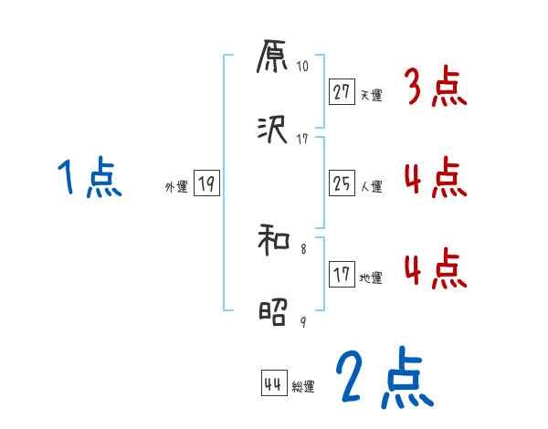 総運![]() | 原沢和昭さんの総運は44画の2つ星!誠実で慎重な性格。物事を考えすぎないように注意しましょう。 あなたの人生を表す1番重要な運勢です。生涯を通じて影響する総合運となり、主に50歳以降の晩年期に影響を及ぼします。 |