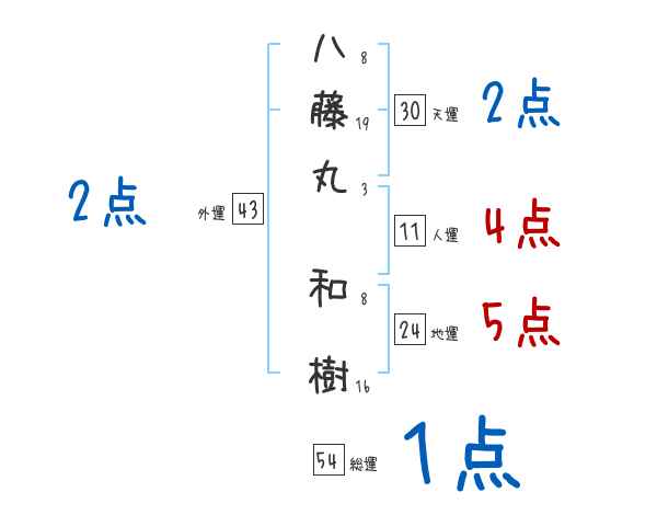 天運![]() | 八藤丸和樹さんの天運は30画の2つ星!浮き沈みの激しさに注意しましょう。 家系が持つ宿命的な運勢を表します。祖先から受け継いだ苗字ですので自分の力が及びません。家柄を象徴します。 |