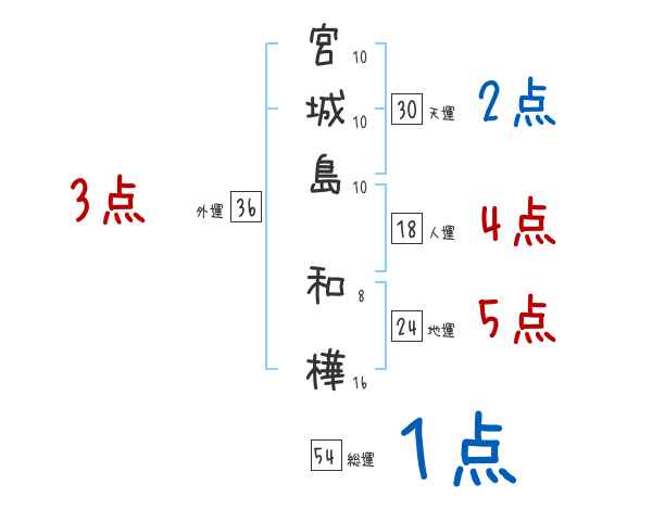 外運![]() | 宮城島和樺さんの外運は36画の3つ星!先見性が豊かです。多少神経質で苦労することも。 生活面を象徴する運勢です。外部から受ける影響力を表し、結婚運、家庭運や職場、環境への順応性を表します。 |