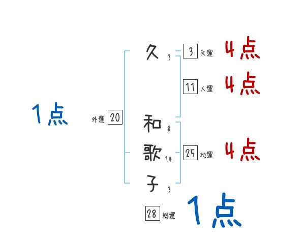 天運![]() | 久和歌子さんの天運は3画の4つ星!活動的で才能に恵まれ、多くの信頼を得る。希望に満ち成長する。 家系が持つ宿命的な運勢を表します。祖先から受け継いだ苗字ですので自分の力が及びません。家柄を象徴します。 |