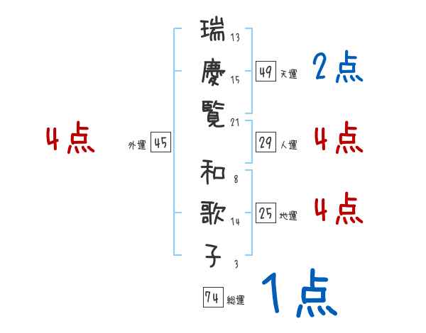 総運![]() | 瑞慶覧和歌子さんの総運は74画の1つ星!無気力で怠惰な生活送りがち。規則正しい生活を送るよう気をつけましょう。 あなたの人生を表す1番重要な運勢です。生涯を通じて影響する総合運となり、主に50歳以降の晩年期に影響を及ぼします。 |