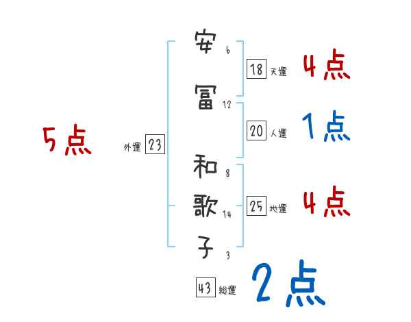 外運![]() | 安冨和歌子さんの外運は23画の5つ星!想像力に優れ活力がある。一代で成功し名誉を手に入れる。 生活面を象徴する運勢です。外部から受ける影響力を表し、結婚運、家庭運や職場、環境への順応性を表します。 |