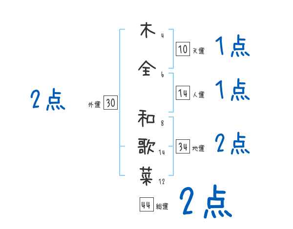 総運![]() | 木全和歌菜さんの総運は44画の2つ星!誠実で慎重な性格。物事を考えすぎないように注意しましょう。 あなたの人生を表す1番重要な運勢です。生涯を通じて影響する総合運となり、主に50歳以降の晩年期に影響を及ぼします。 |