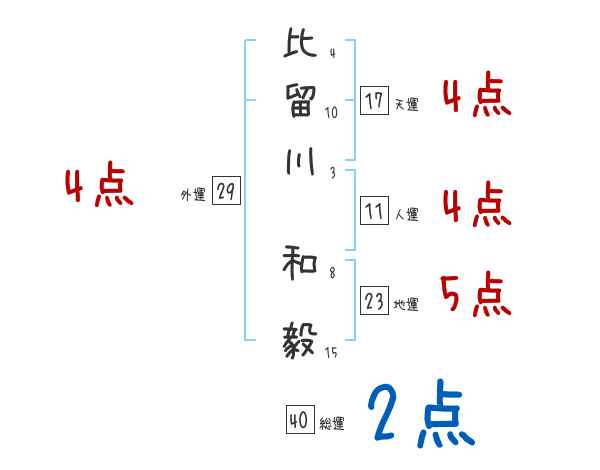 外運![]() | 比留川和毅さんの外運は29画の4つ星!完全主義で才能がある。厳格な心の持ち主。 生活面を象徴する運勢です。外部から受ける影響力を表し、結婚運、家庭運や職場、環境への順応性を表します。 |