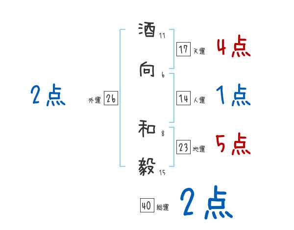 天運![]() | 酒向和毅さんの天運は17画の4つ星!積極的な行動力。地位を気づき財産を手に入れる。純粋な心と直感力。 家系が持つ宿命的な運勢を表します。祖先から受け継いだ苗字ですので自分の力が及びません。家柄を象徴します。 |
