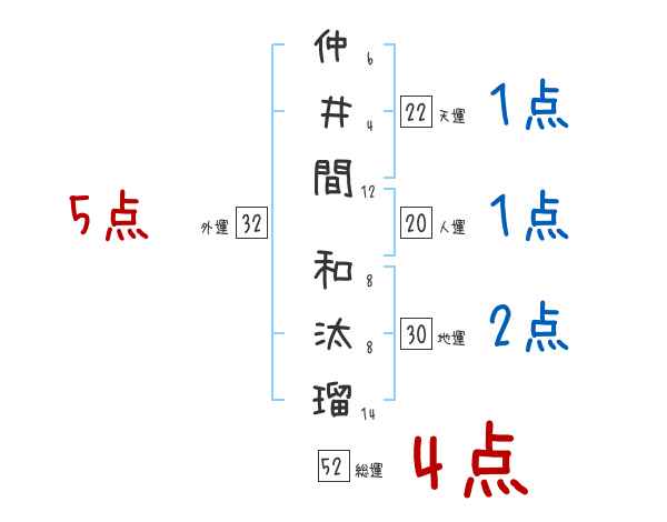 外運![]() | 仲井間和汰瑠さんの外運は32画の5つ星!柔軟性があり成功する。チャンスが多く金運が良い。 生活面を象徴する運勢です。外部から受ける影響力を表し、結婚運、家庭運や職場、環境への順応性を表します。 |