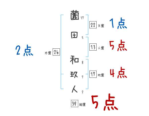 人運![]()  | 薗田和玖人さんの人運は13画の5つ星!才能に恵まれ人気がある。名声を手に入れる。円満な人生。 性格や才能などを表す2番目に重要な運勢です。人間関係や協調性、社会的な成功に影響します。主に20歳から50歳ぐらいまでの中年期の運勢を表します。 |