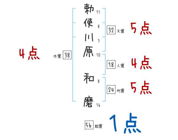 天運![]() | 勅使川原和磨さんの天運は32画の5つ星!柔軟性があり成功する。チャンスが多く金運が良い。 家系が持つ宿命的な運勢を表します。祖先から受け継いだ苗字ですので自分の力が及びません。家柄を象徴します。 |