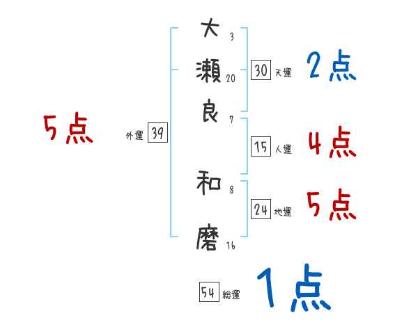 天運![]() | 大瀬良和磨さんの天運は30画の2つ星!浮き沈みの激しさに注意しましょう。 家系が持つ宿命的な運勢を表します。祖先から受け継いだ苗字ですので自分の力が及びません。家柄を象徴します。 |
