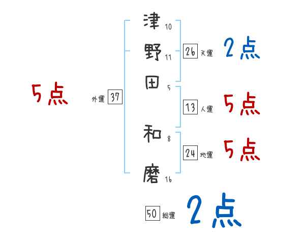 外運![]() | 津野田和磨さんの外運は37画の5つ星!努力家で順応性に優れる。現実的な考え方ができ忠実に物事をこなす。 生活面を象徴する運勢です。外部から受ける影響力を表し、結婚運、家庭運や職場、環境への順応性を表します。 |