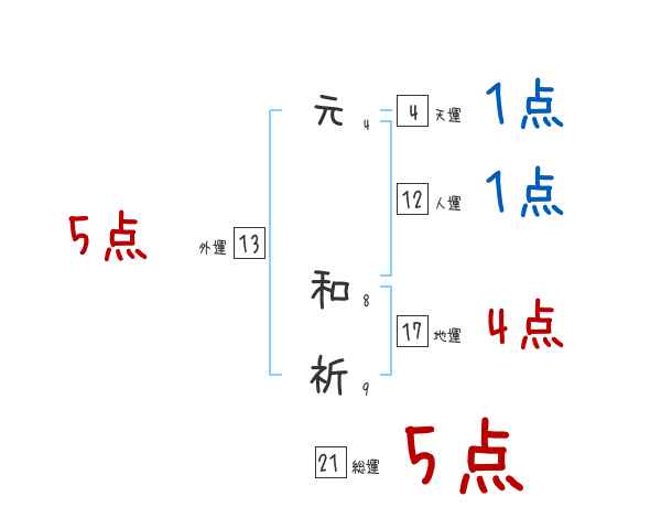天運![]() | 元和祈さんの天運は4画の1つ星!感情が不安定で苦労するかも。周囲との協調を心掛けましょう。 家系が持つ宿命的な運勢を表します。祖先から受け継いだ苗字ですので自分の力が及びません。家柄を象徴します。 |